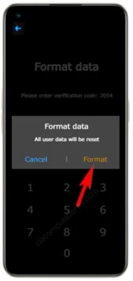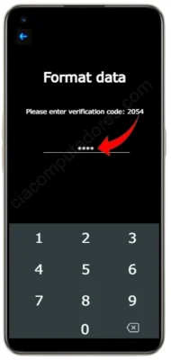 Passo 6: Na tela format data, use o teclado virtual para digitar o código de verificação solicitado, você verá os 4 números após a descrição “Please enter verification code:”.
