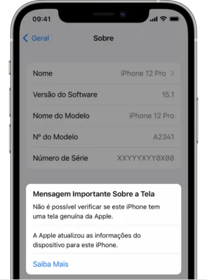 Posteriormente, essas mensagens se manifestam na tela principal das configurações por mais 15 dias, antes de serem transferidas para a seção “Sobre”, onde fornecem detalhes sobre o hardware do dispositivo. O objetivo da Apple com essa abordagem é transparente: além de alertar o consumidor sobre a natureza não genuína da tela, busca incentivá-lo a procurar reparos em um serviço autorizado pela marca.
